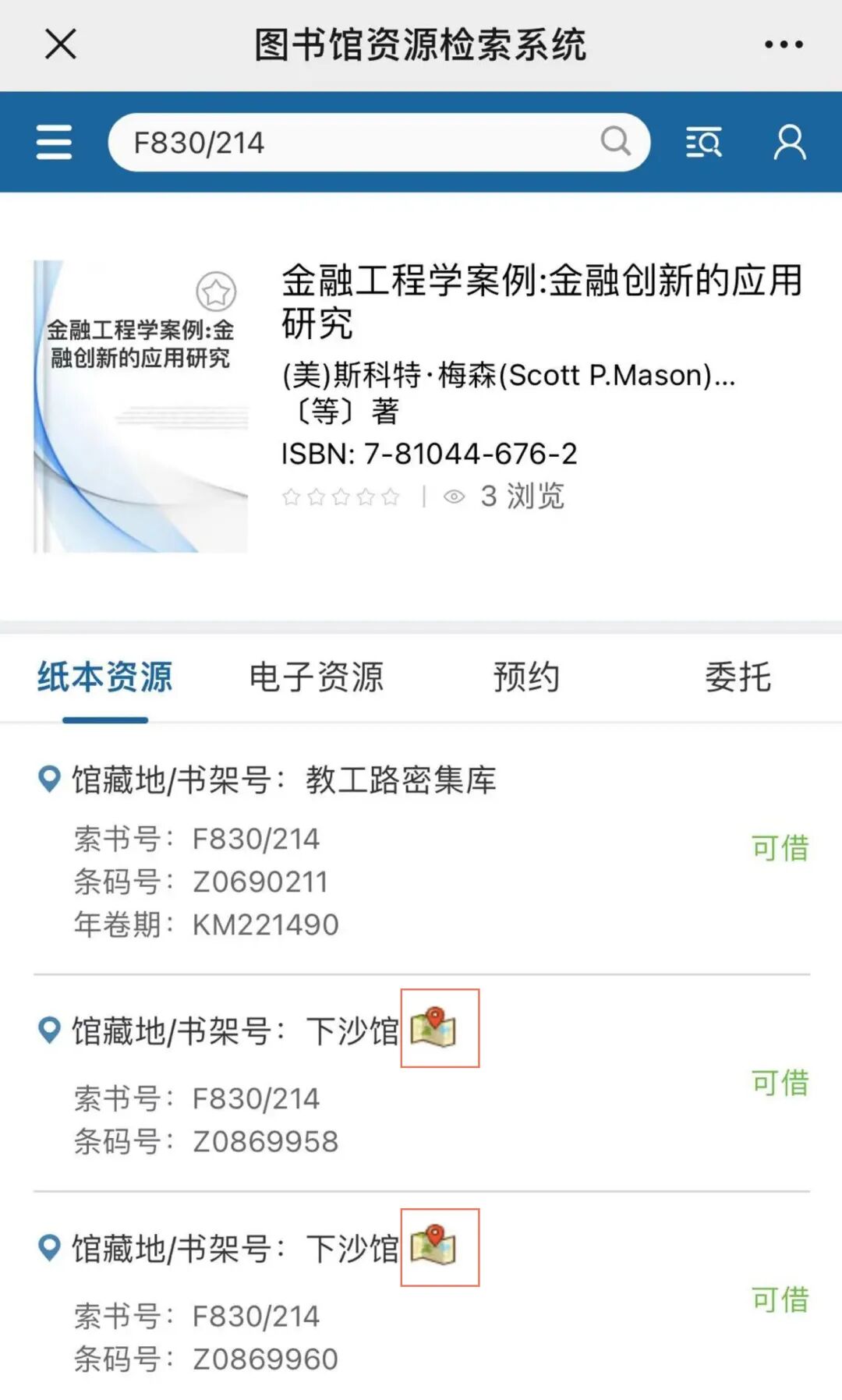 ●检索到所需图书后,点击导航图标,即可获知图书所在楼层和书架的位置信息,可节省读者搜寻馆藏资源时间。