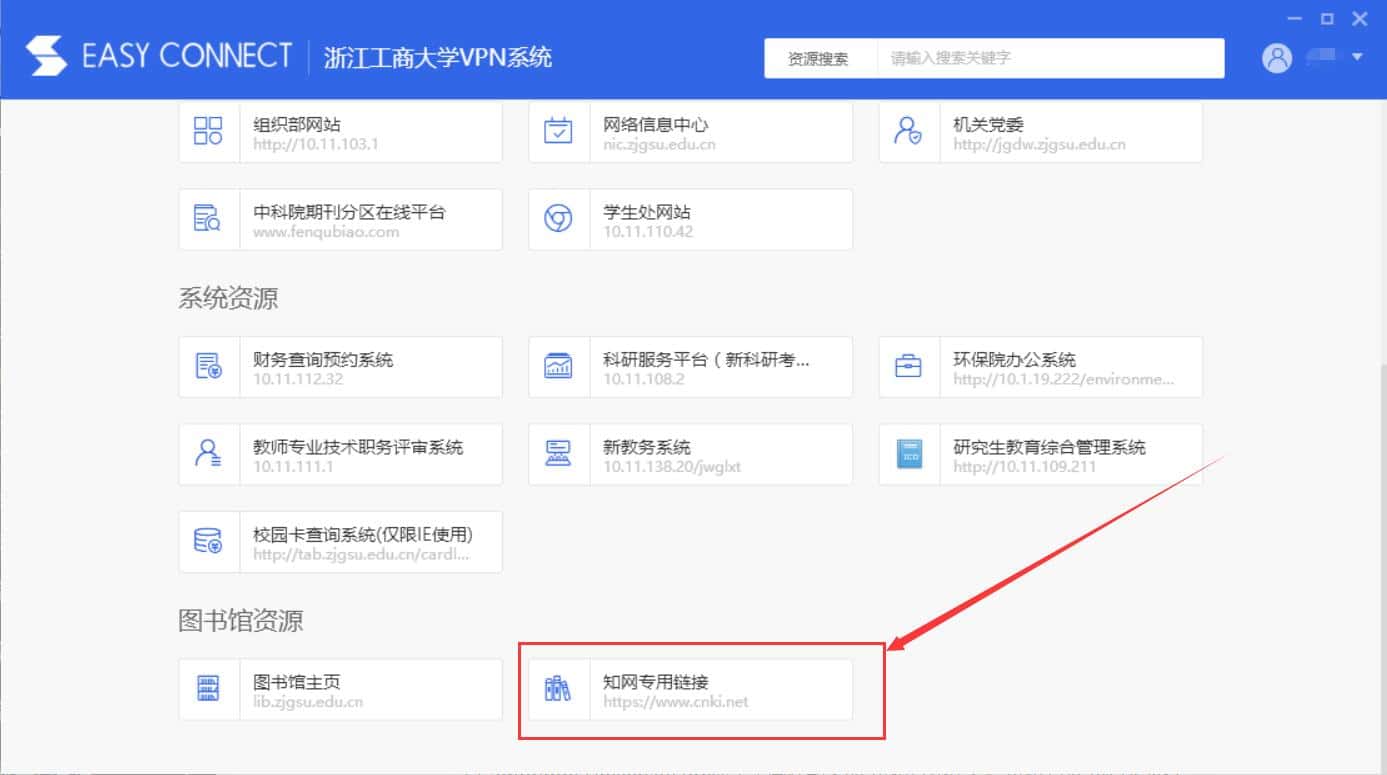 VPN代理下使用知网时,若出现文献无法下载,可在VPN登录成功后的界面上点击“知网专用链接”进入知网数据库,如下图所示。