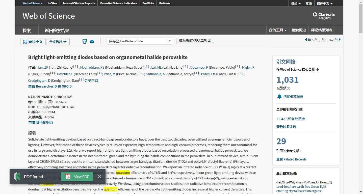 4. 打开Web of Science或者其他数据库,进入详细文献页面时,将会在页面下方(悬浮于文字上方)出现如下图标和实例页面。点击“View PDF”即可进行文献的阅读、下载。