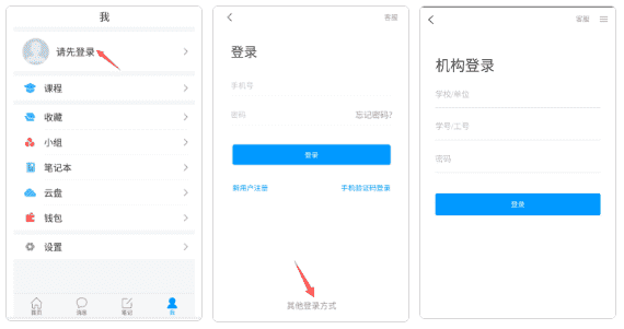 (1)点击左上角小人图像,出现登录界面,选择页面下方的“其他登录方式”,进入“机构登录”页面。