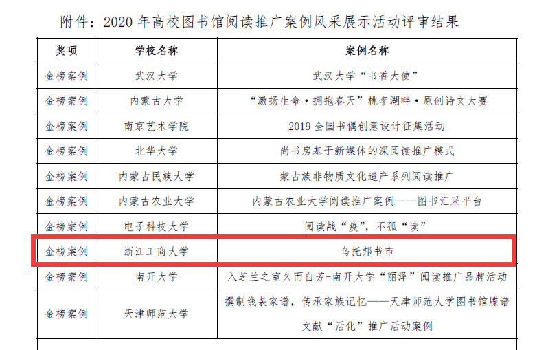 近日,在“2020年高校图书馆阅读推广案例风采展示活动”中,我校图书馆报送的“乌托邦书市”入选金榜,是浙江省唯一一家入选金榜的高校图书馆案例。