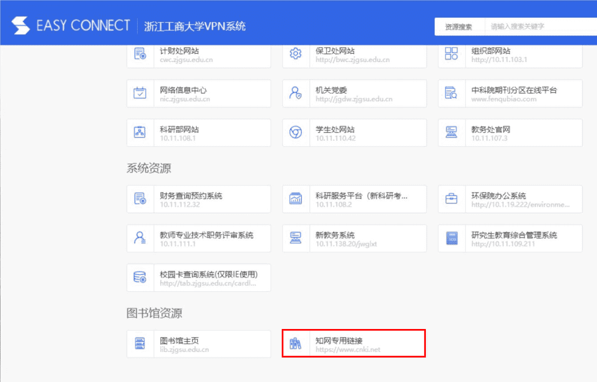 另外,中国知网除了通过CARSI访问外,还可在VPN(VPN访问指南)登录后选择“知网专用链接”访问。如图: