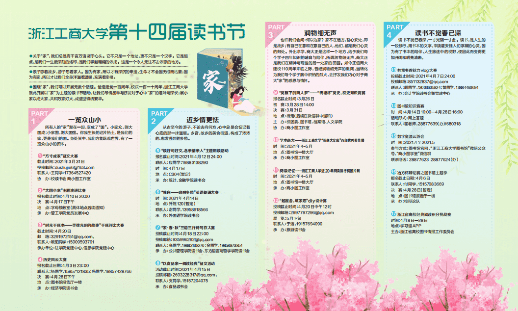 亮点之三:内容丰富,形式多样。从活动内容上来看,本届读书节共策划推出17项系列活动,活动数量多。17项活动包括“方寸成家”征文大赛、“大国小家”主题演讲比赛、“时光手账本—寻找光阴的故事”手账评比大赛、历史风云大赛、“读好句好文,念亲情亲人”主题朗诵活动、“独白—唤醒乡愁”英语朗诵大赛、“家•春•秋”三语三行写作大赛、“以食品家—阅读经典”征文活动、“党旗下的商大梦”—“钱塘杯”党史校史知识竞赛、“起屋舍,筑家思”DIY设计赛、共赏书香魅力vlog大赛、图书馆知识竞赛、188bet金宝搏官网下载 云游会、治方杯辩论赛之图书馆主题季、浙江高校经典阅读积分挑战赛等。从活动形式看,既有每年固定的征文,又有新形势下的云游会;既有台下生动活泼的竞赛,也有网上寓教于乐的PK;既有激发兴趣的设计赛,也有当下热门的短视频比拼。