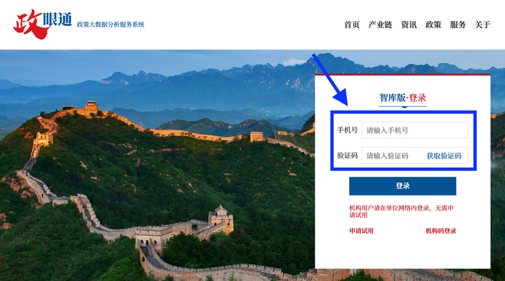 访问方式:首次登录需要在学校IP范围内,使用电脑浏览器(推荐360浏览器)登录www.zytdata.com,点击智库版进入登录页面。输入手机号和验证码即可登录使用。除首次登陆需要在学校网络内,之后登陆将不受地理位置限制,全国都可以使用(仍然是手机号+验证码)。