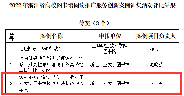 浙江省高校图书馆阅读推广188宝金博 苹果app 创新案例征集活动由浙江省高等学校图书情报工作委员会主办,旨在促进我省高校图书馆阅读推广及188宝金博 苹果app 创新,激发广大高校图书馆员的创意热情。根据《2022 年浙江省高校图书馆阅读推广188宝金博 苹果app 创新案例研议标准》,经专家评比,金宝搏官网188be “读祛心病 悦读悦心——金宝搏官网188be 阅读疗法特色188宝金博 苹果app 案例”以价值引领的积极导向性、推广形式及内容的创新性、影响实效性及典型性,被授予“一等奖”荣誉称号。