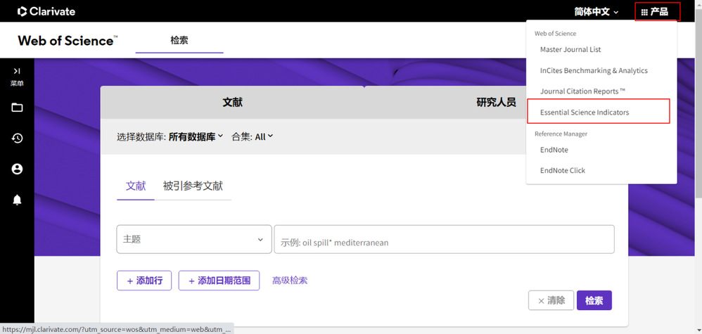 第一步:进入WOS界面,点击右上方的产品,在下拉菜单中选择“Essential Science Indicators”。