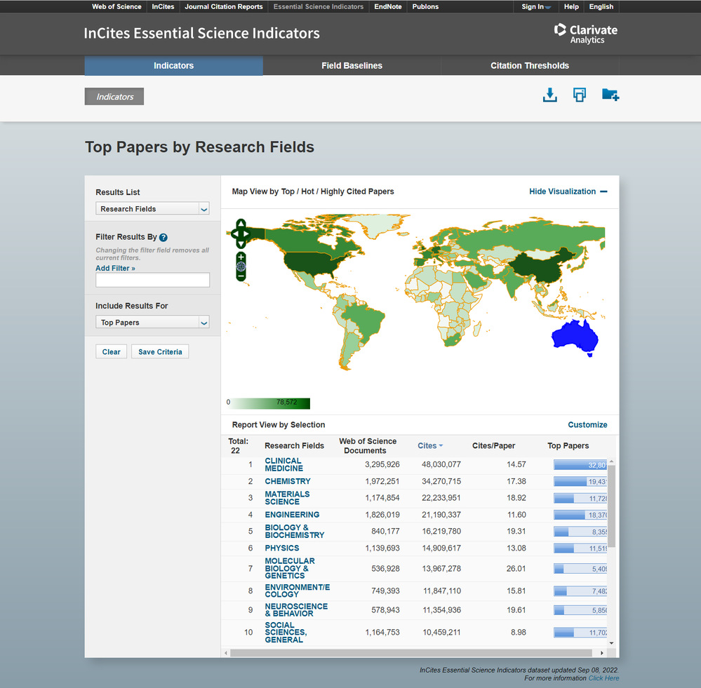 Essential Science Indicators(基本科学指标,简称ESI)是一个基于Web of Science核心合集数据库的深度分析型研究工具。ESI收录了超过9000种期刊(SCI和SSCI)里的文献(Article和Review),并对每一种期刊均按照22个学科进行了一对一地分类标引,没有重叠的学科设置使得分析变得更为清晰。ESI拥有客观的科研绩效基准值,提供最近十多年的滚动数据。