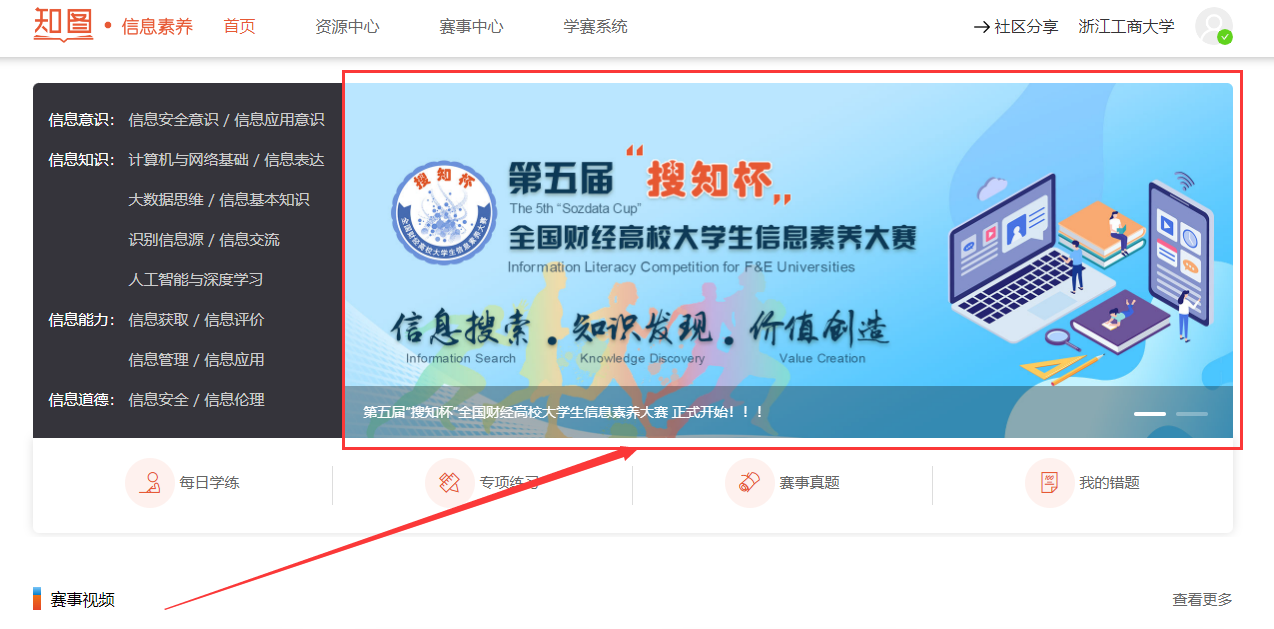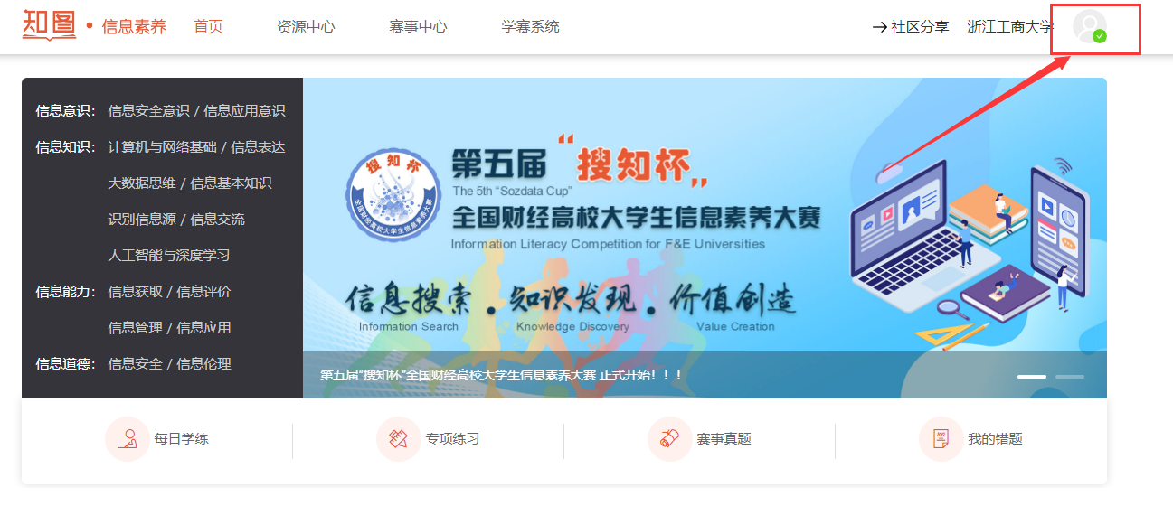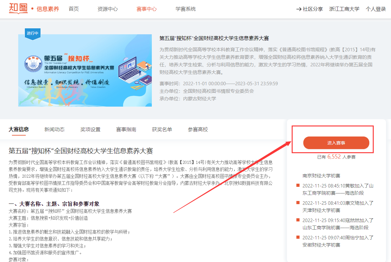 3.赛事报名:“知图”首页,点击第五届“搜知杯”全国财经高校大学生信息素养大赛图标,或直接访问链接https://zhitu.sozdata.com/site.html#/race/detail?id=195