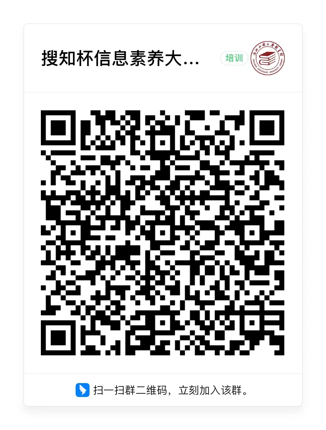 报名方式:参赛选手需在“知图”平台注册个人账号、完成机构认证。报名成功后,请加入大赛钉钉群与微信群,进群后请备注学院和姓名。比赛相关流程将在图书馆微信公众号和沟通群发布。