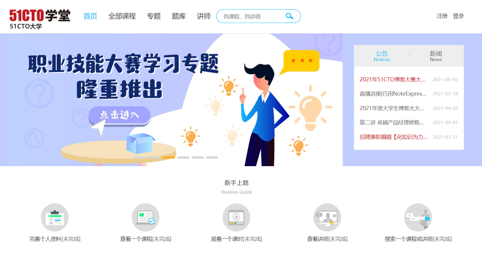 51CTO学堂是51CTO旗下专业的职业教育培训平台,在IT技术领域拥有强大的影响力,51CTO学堂秉承“学以致用”、 “因材施教”、“有教无类”的教育理念,提供辅导式“精品班”和自学式“视频课程”两种在线学习模式,致力于为在职IT技术人群、技术爱好者、大学生提供全品类精品课程,解决其就业、考试认证和技能提升的需求,为社会培育实用型IT技术人才。目前涵盖大数据、人工智能、前后端开发、软考、PMP等22个大类160个二级技术分类,拥有4500位讲师21000门课程。