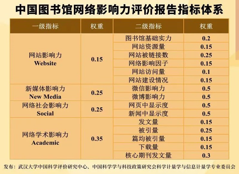 该报告由武汉大学中国科学评价研究中心和中国科学学与科技政策研究会科学计量学与信息计量学专业委员会联合研发,通过网站影响力、新媒体影响力、网络社会影响力、网络学术影响力等四个方面构建了系统的中国图书馆网络影响力评价体系。报告选取的评价对象十分全面,共囊括了2759所高校图书馆、1488所公共图书馆和66所专业图书馆。