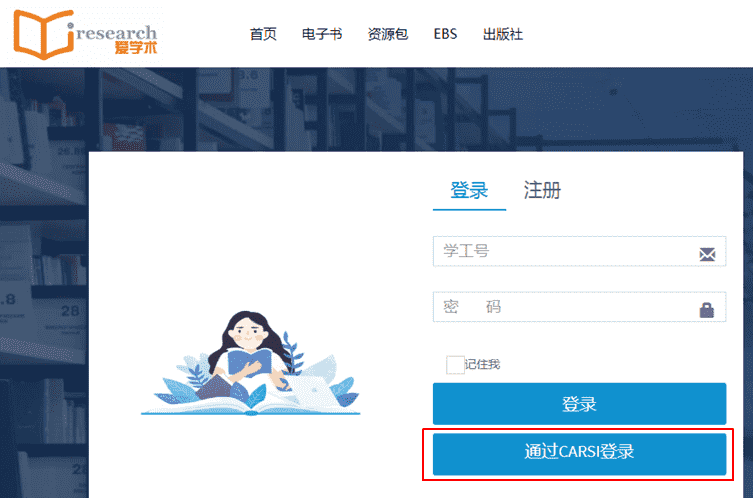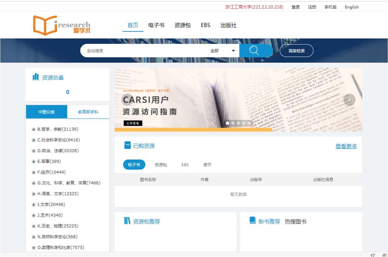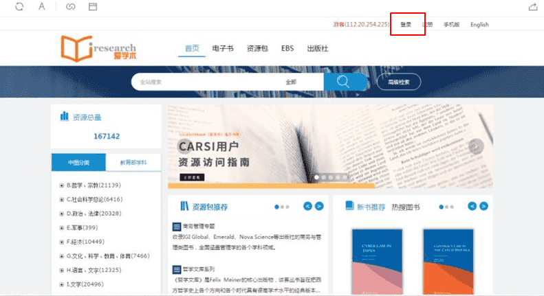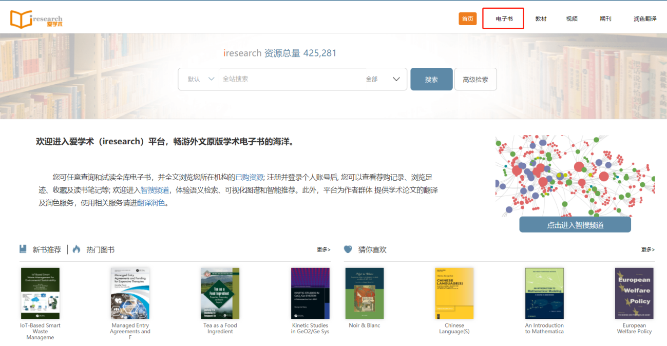访问平台首页www.iresearchbook.cn,点击右上角的电子书
