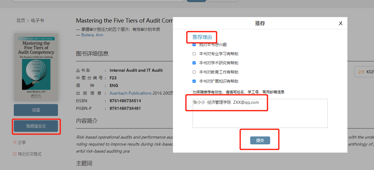 在爱学术平台中,找到心仪的学术电子书,点击推荐图书的详情页-我想读全文-勾写推荐理由-填写荐购人信息(备注邮箱很必要)-提交,即可完成推荐过程。
