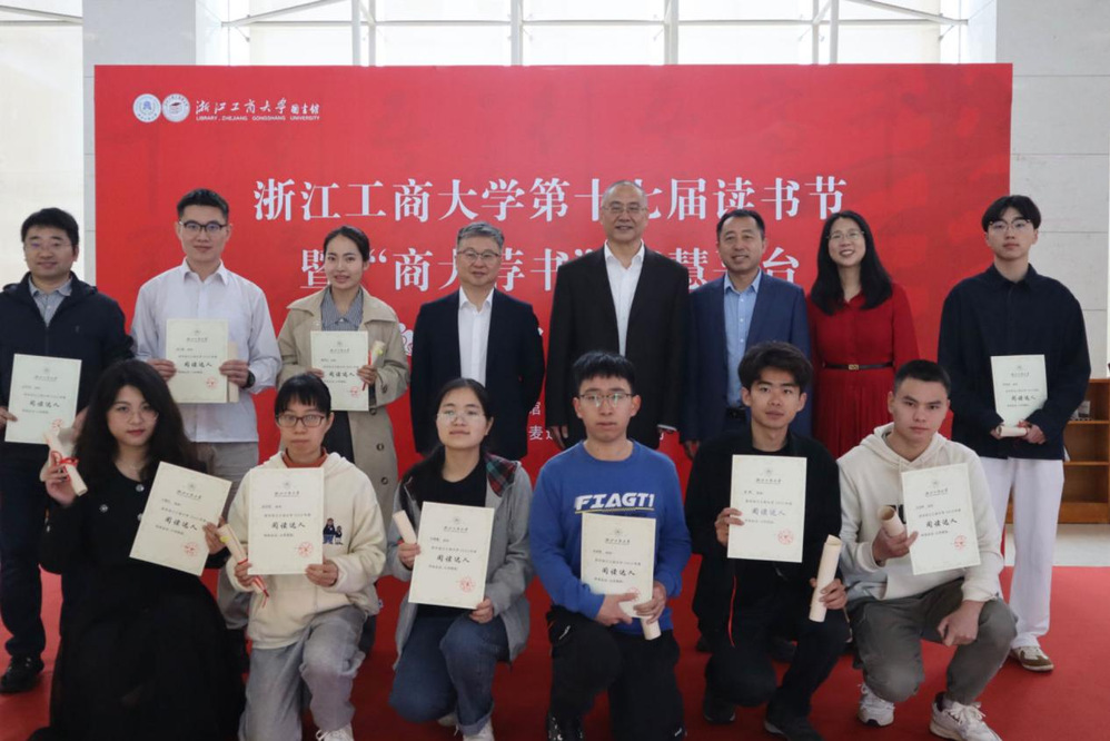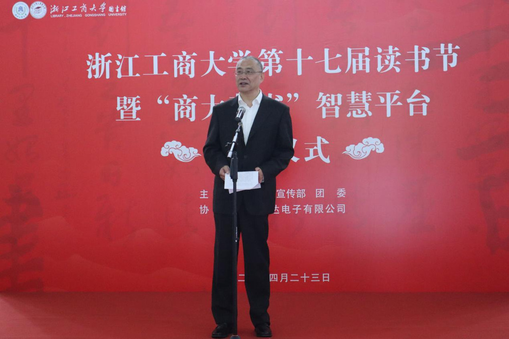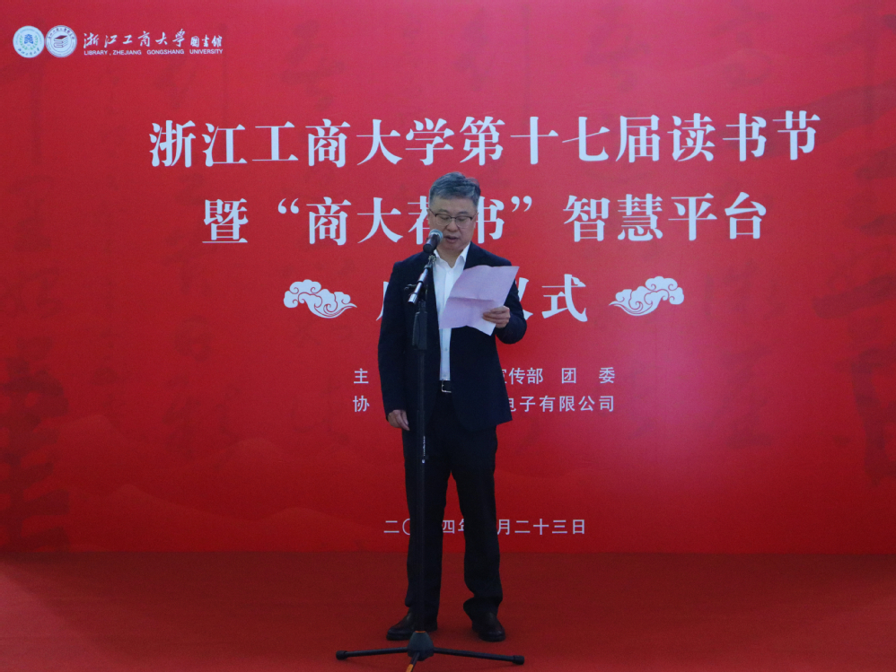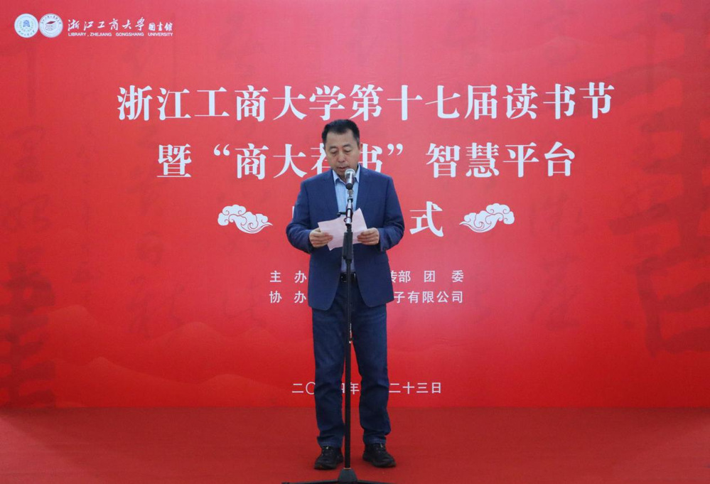 4月23日上午,浙江工商大学第十七届读书节暨“商大荐书”智慧平台启动仪式在图书馆一楼大厅隆重举行,浙江工商大学副校长赵英军、杭州麦达电子有限公司总经理郑智宇、金宝搏官网188be 馆长毛丰付出席仪式并致辞,30余位师生代表出席了活动。仪式由图书馆副馆长赵丹主持。