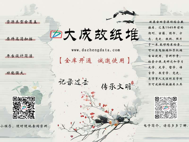 《大成故纸堆数据库》是专门收录古旧资源的综合数据库。包括7个子库:《大成老旧刊全文数据库》、《大成古籍文献全文数据库》、《大成民国图书全文数据库》、《中国各地古方志集》、《中共党史期刊数据库(-1949)》、《大成近现代报纸数据库》、《大成老照片数据库》。汇集1949年前的期刊、古籍、图书、方志、党史、报纸、照片七大类古旧文献于一库,能够跨库检索,可以在电脑端和手机端自由使用,资料珍贵,检索方便,直接阅读及下载。是研究文学、史学、哲学、语言学、艺术、教育学、民族学、马克思主义、党史、地方志书、人文科学和社会科学等不可或缺的数据库工具。