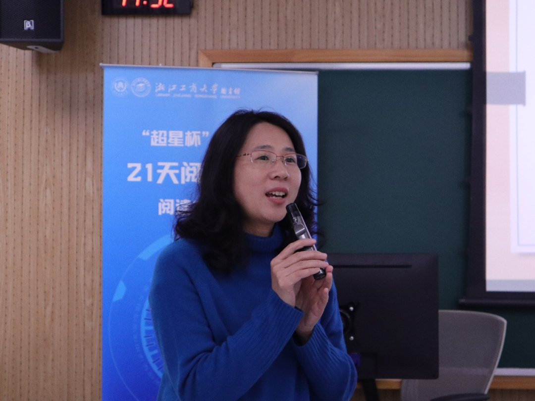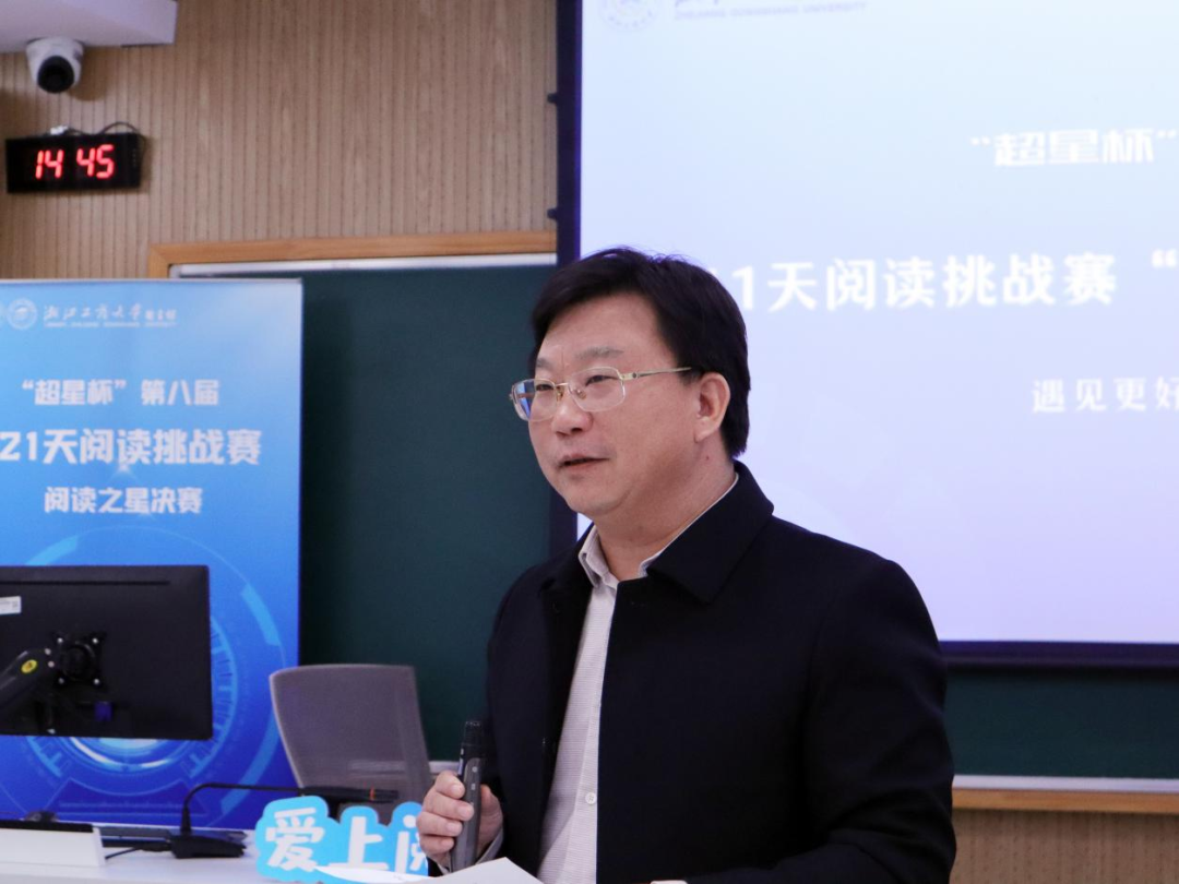作为嘉宾图书馆副馆长赵丹表示,与去年相比,本届比赛在空间拓展方面得到了更大提升,桐庐校区杭州商学院的老师专程前来参加。她期望 21 天阅读挑战赛能为终身学习机制树立示范模板,未来有更多老师参与其中,也希望有更多学校领导及相关领域专业老师加入评审团队,使阅读的火种在商大广泛传播。