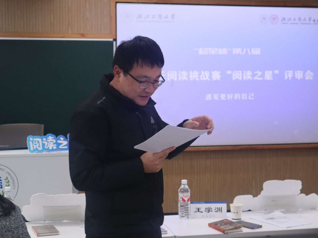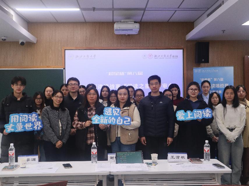 2024年12月23日,“超星杯”第八届21天阅读挑战赛学生组“阅读之星”评选活动在A217教室举办。来自浙江工商大学经济学院教授王学渊、校团委副书记谢晓梅、学生处学生管理科主管金帅、宣传部融媒中心王津航、图书馆阅读推广部主任沈银红五位老师受邀出席活动并担任评委。来自不同学院、不同年级的19名优秀同学在决赛相遇,为大家分享他们的阅读经历和体悟,向大家推荐自己在这次挑战中读过的印象最深刻的书籍。