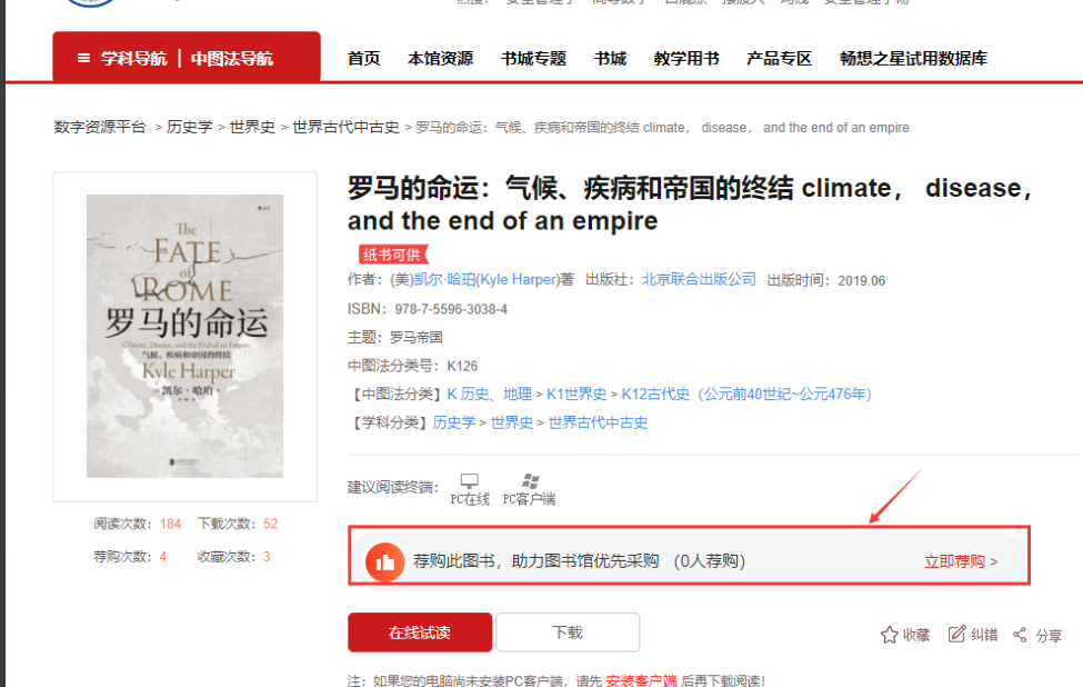 书城资源中本馆未开通试用的电子书,点击进入图书详情页,可以“在线试读”,感兴趣的电子书可以点击“荐购”推荐给图书馆购买。
