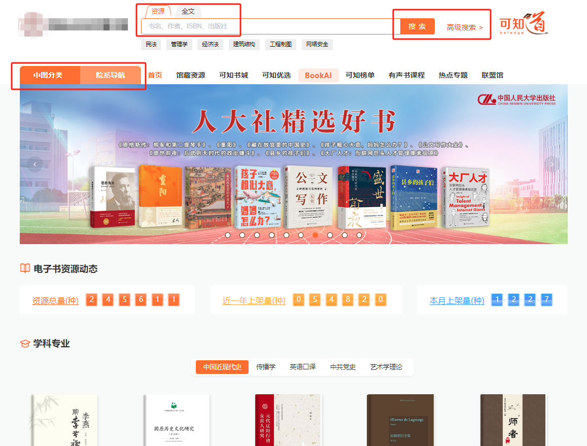 1. 资源查找:可根据院系专业分类或通过关键字、出版社、作者、ISBN进行资源检索和查找。